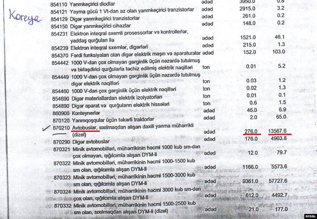 Həmin sənəd yalnız nazirliklər və dövlət orqanları üçün məhdud sayda çap edilir. Burada həm ölkələr, həm əməliyyat növləri, həm də mal qrupları və mallar üzrə bütün göstəricilər yer alıb. Məhz bu kitabda qeyd olunub ki, Azərbaycana ümumilikdə 1068 avtobus gətirilib və onlara 51 milyon 642 min 300 dollar, təqribən 52 milyon dollar xərc çəkilib.