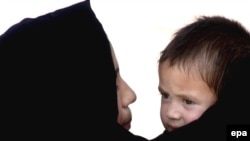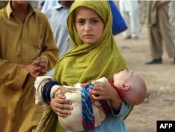 Qaçqın düşərgəsində içməli su növbəsində dayan tənha ana, Pakistan, 07.2009