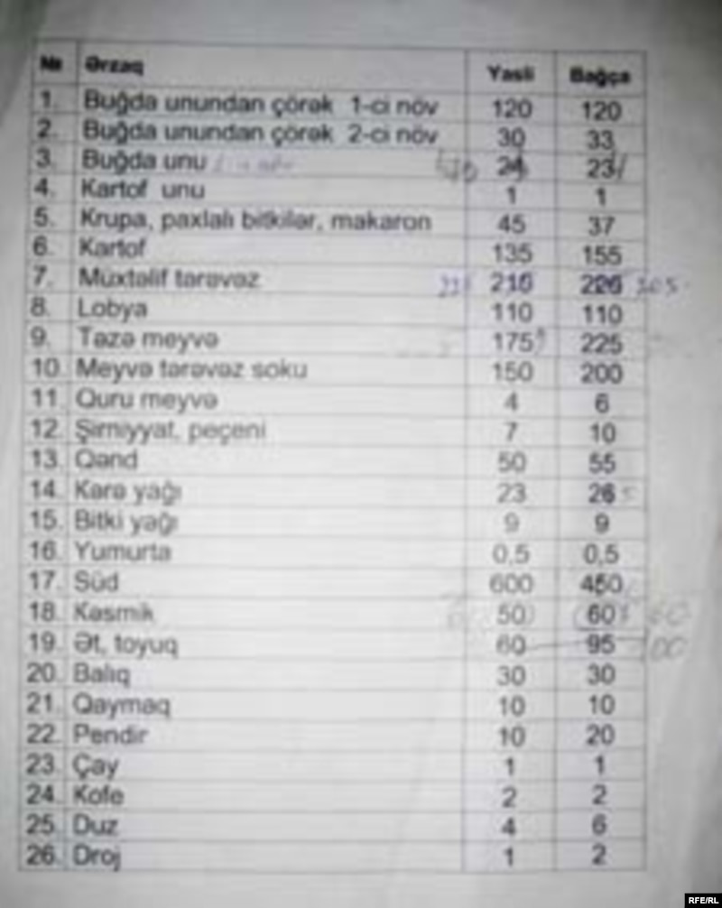 Həm ARDNŞ, həm də Təhsil Nazirliyinin balansında olan uşaq bağçalarının qida rasionu eynidir. Nazirlər Kabinetinin 1994-cü ildə çıxardığı qərara əsasən gün ərzində hər uşağa 120 q çörək, 220 q tərəvəz, 25 q kərə yağı, 55 q şəkər, 100 q ət, 460 q süd, 200 q şirə, 60 q kəsmik, 220 q meyvə və sadalamadığım digər bir sıra ərzaq məhsulları verilməlidir.
