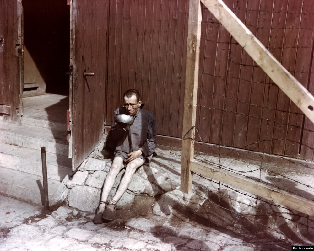 Buxenvald düşərgəsindəki əsir barakın qarşısında metal qabdab su içir.