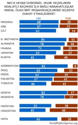 Daha dəqiq desək, WorldPublicOpinion.org soruşub ki, «Necə hesab edirsiniz əgər seçkilərin ədalətli keçməsi ilə bağlı narahatlıqlar varsa, ölkə BMT müşahidəçilərini seçkiyə dəvət etməlidirmi?». Azərbaycanlıların 83 faizi deyib «hə». Azərbaycandan sonra Keniya (82%) və Britaniya (81%) müşahidəçilərin gəlməsini müsbət qiymətləndirib.
