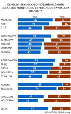 Bu cür cavabı WorldPublicOpinion.org-a rəyi soruşulan azərbaycanlılar deyib. Əslində, bu sual tək Azərbaycanda verilməyib, dünyanın 17 ölkəsinin əhalisinə eyni sual ünvanlanıb. Ancaq Azərbaycanda digər ölkələrdən daha çox beynəlxalq müşahidəçilərin önəmli olması qeyd olunub.