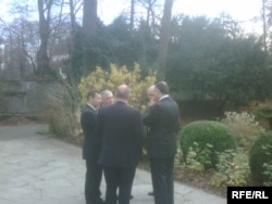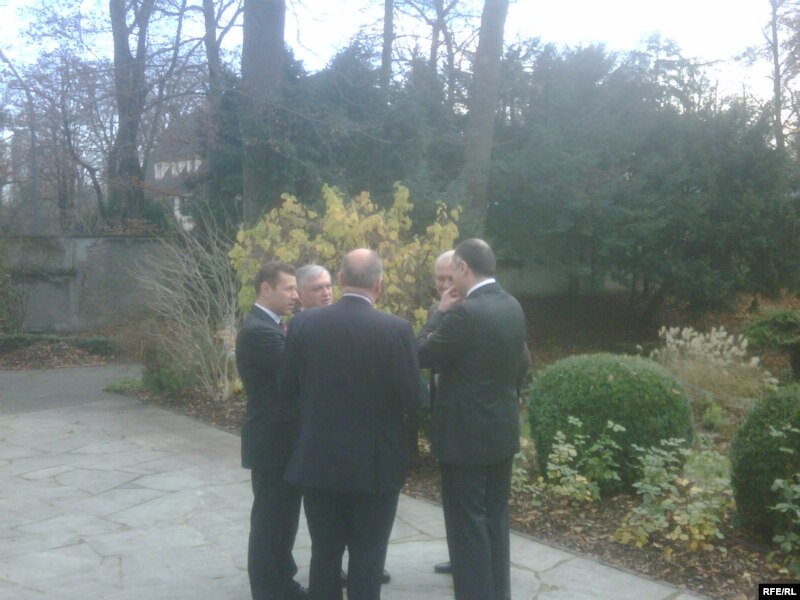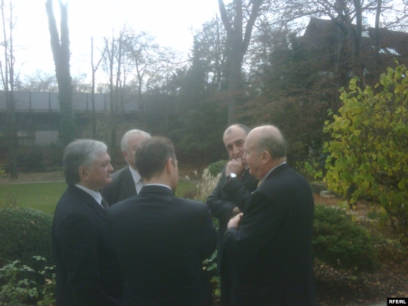 Azərbaycan və Ermənistan prezidentləri təkbətək görüşürkən, iki ölkənin Xarici İşlər nazirləri və ATƏT-in Minsk Qrupunun həmsədrləri Fransanın Münhendəki konsulunun iqamətgahının həyətində - 22 noyabr 2009