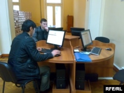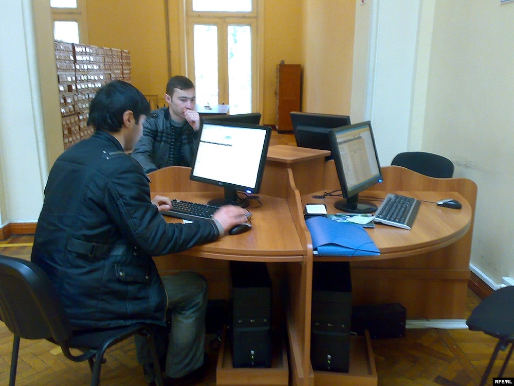 Biletimizi nəzarətçiyə göstərib yuxarı, kataloq zalına qalxırıq. Sovet dövründən bəri istifadə olunan rəflərə düzülmüş kataloqların yanına kompyuterlər əlavə olunmuşdu. Gün ərzində 1000-1500 oxucusu olan bir kitabxanaya 8 kompyuter qoyulub. Onlarla oxucu rəflərə düzülmüş kataloqların əlində qalmışdılar. Biz də onlara qoşulub kitab axtarışına çıxdıq. 40 dəqiqəmizi sərf etsək də istədiyimiz kitabın adını kataloqdan tapa bilmədik.