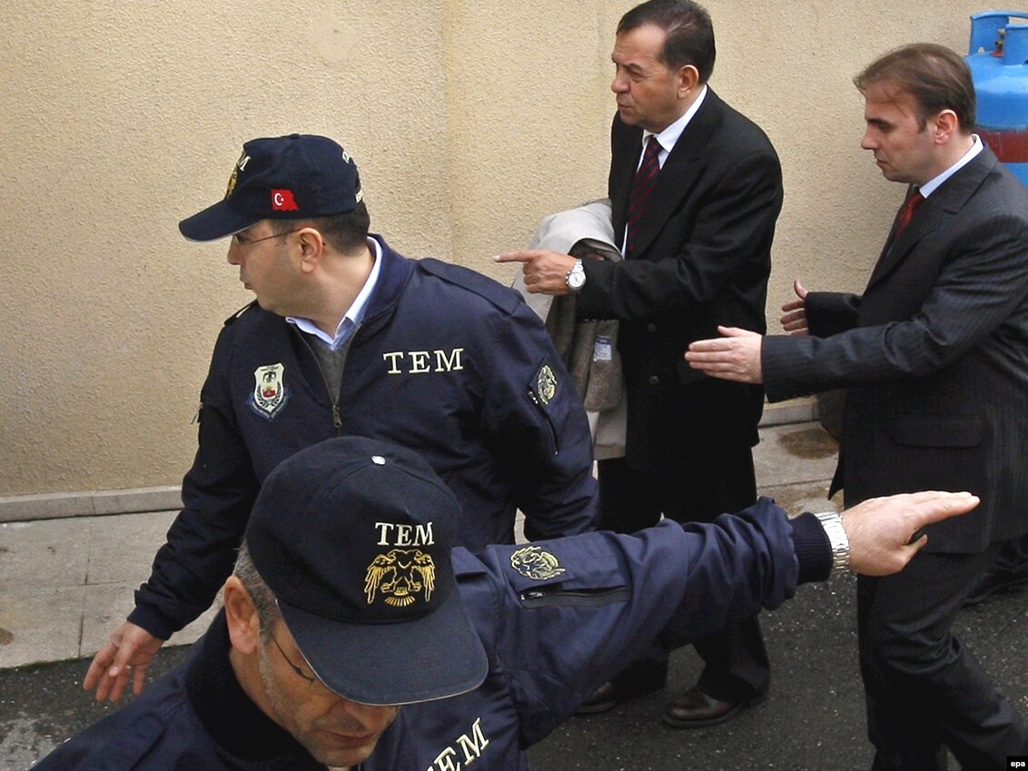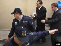 Türkiyə Hərbi Dəniz Qüvvələrinin keçmiş komandanı Özdən Örnək polisin müşayiəti ilə İstanbul məhkəməsinə gəlir, 25 fevral 2010