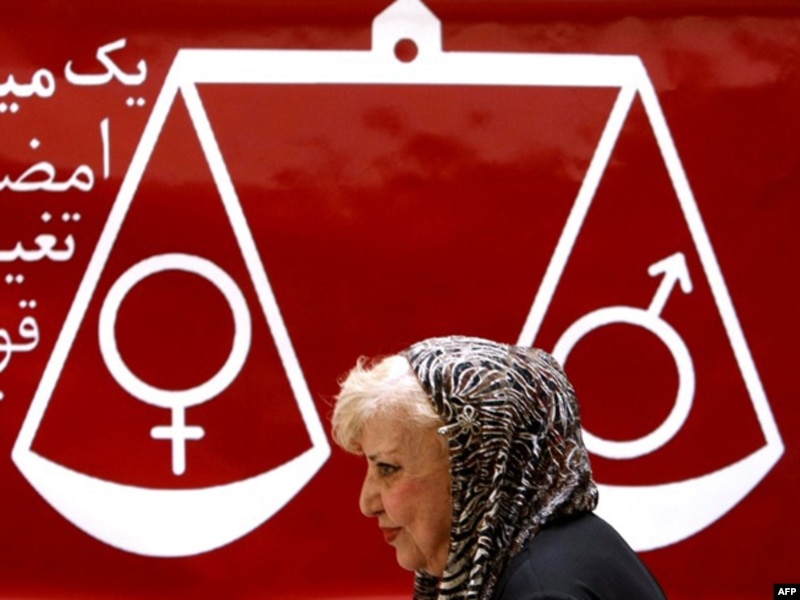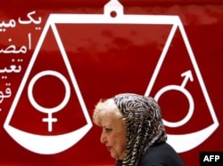 Simin Behbahani Tehranda "birtərəfli qanunları dəyişək" kampaniyasının posteri qarşısında. 27 avqust 2007