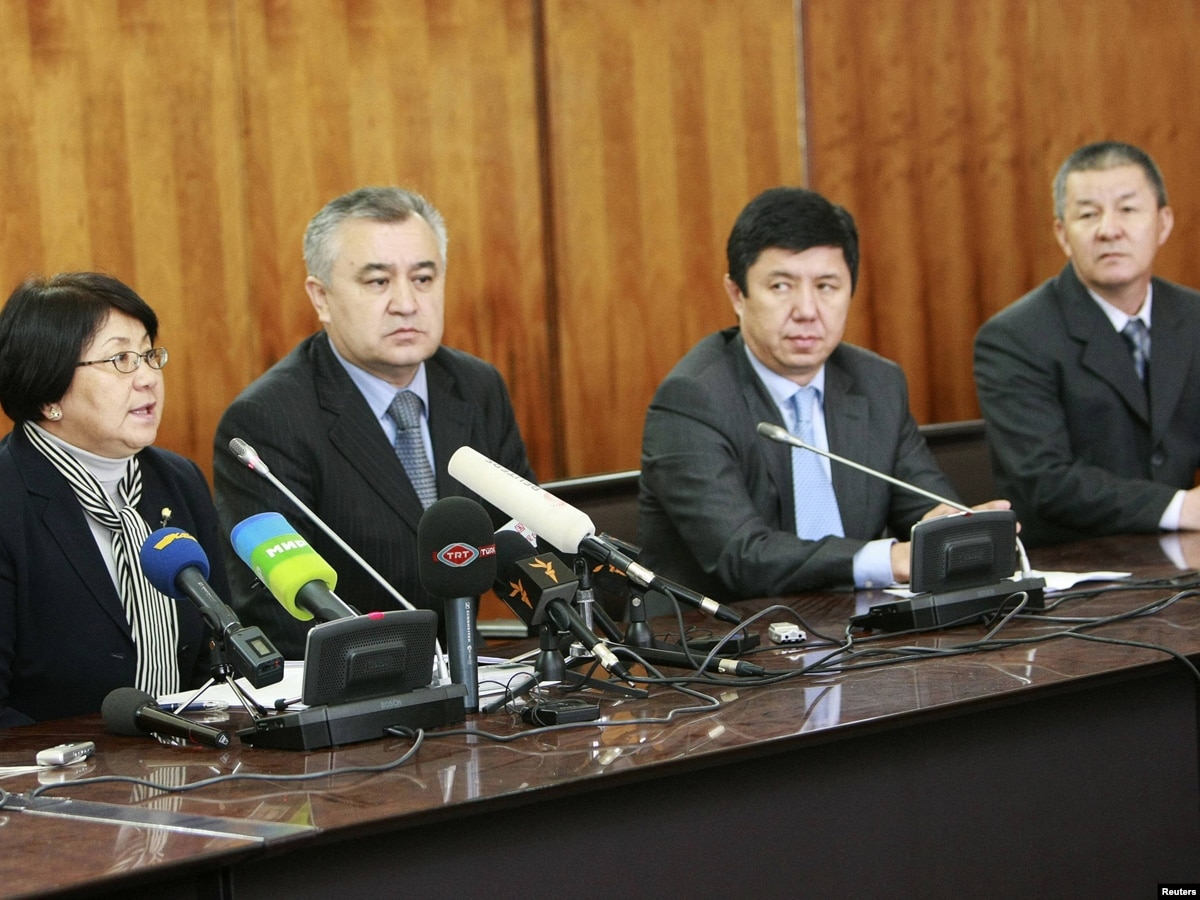 Müvəqqəti hökumətin rəhbəri Roza Otunbayeva, Baş nazirin müavinləri Omurbek Tekebayev ilə Temir Sariyev və Müdafiə naziri İsmayıl İsakov Bişkekdə mətbuat konfransında, 8 aprel 2010