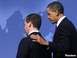 Barak Obama Vaşinqtonda rusiyalı həmkarı Dmitri Medvedevi salamlayır, 12 aprel 2010
