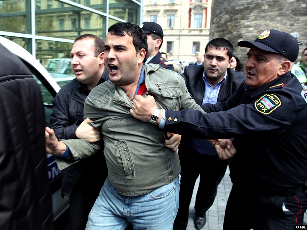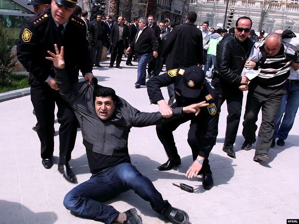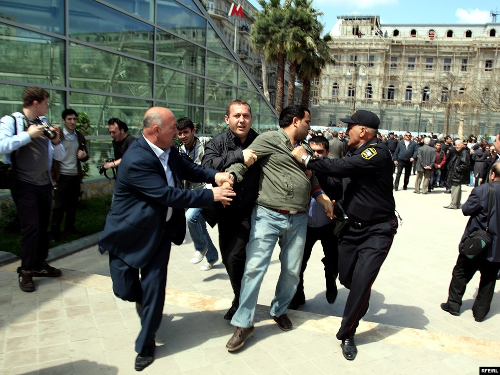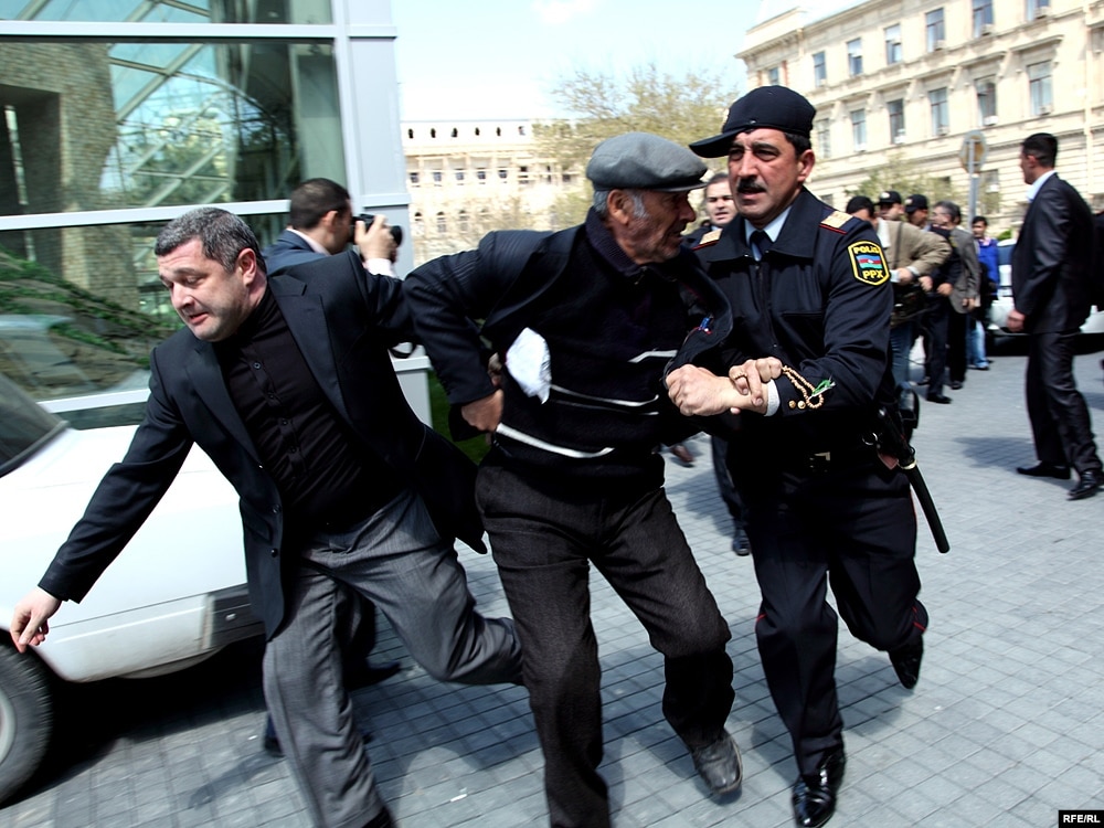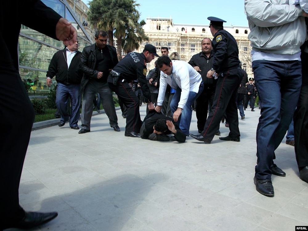Aksiyanın dağıdılmasında iştirak edən mülki geyimli şəxslər jurnalistləri ərazidən uzaqlaşdırırlar. Onlar AzadlıqRadiosunun müxbirinə özlərini sıravi vətəndaş kimi təqdim ediblər.