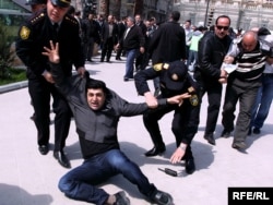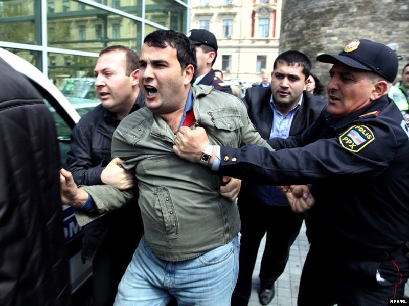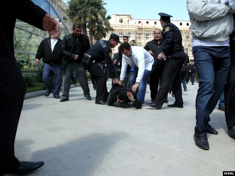 Группа молодежи неожиданно для полиции стала скандировать антиправительственные лозунги и двинулась от метро “Ичеришехер” в сторону здания администрации президента. Журналиста стали снимать акцию на фото и видео. Полиция бросилась вдогонку и задержала протестующих. После этого, полицейские бросились на журналистов. Зажав репортов в круг, полицейские стали бить их ногами.