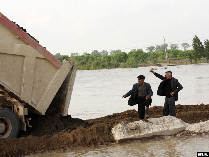 - «KAMAZ»larla torpaq daşıyıb tökürük, camaat da kimisi əllə, kimisi isə bellə torpağı bəndin üstünə yayır. Suyun səviyyəsi 5-6 sm qalxıb. Sel suları səviyyəni qaldırır.