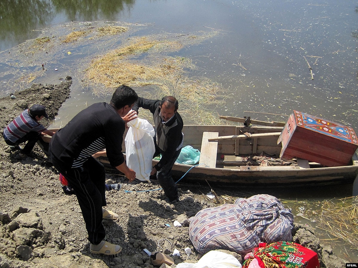 Sakinlər ev əşyalarını qayıqla daşıyır