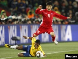 Braziliyalı Robinho Şimali Koreyalı Ri Jun-ilin üstündən hoppanır ki, topla hərəkətini davam etdirsin