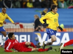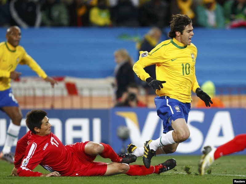 Brazillyalı Kaka və Şimali Koreya oyunçusu An Yong-hak top uğrunda mübarizədə