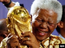 Nobel Mükafatı laureatı Nelson Mandela Dünya Kubokunu başı üzərinə qalıdırır, 14 may 2004