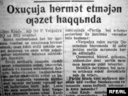 «Yeni kənd» qəzetinin 1938-ci ildə çıxan nömrələri nəzərdən keçirilərkən məlum oldu ki, bu qəzet rayonun siyasi, təsərrüfat, qultura, yaşayış məsələlərini düzgün işıxlandırmır. Oxucusuna hörmət etməyən və bolşevik mətbu sözünün müstəsna rolunu başa düşməyən «Yeni kənd» qəzetinin redaktoru Məmmədzadə qəzet səhifələrini ağzına gələn sözlərlə doldurmağa adət etmişdir. O, oxucusu qarşısında heç bir məsuliyyət hiss etmədən qəzetdə kobud siyasi və texniki səhvlərə yol verir. O, dərc edilən materialların keyfiyyətinə əsla əhəmiyyət vermir. Bu qəzetin 14 (69) nömrəsində «Partiya boy artımı» sərlövhəsi ilə yazılmış «məqalə» belə başlanır: