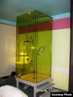 … душ возведен на эдакий пьедестал и полностью прозрачный. Лежа на кровати можно смотреть телевизор, а можно и на кого-то в душе…