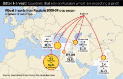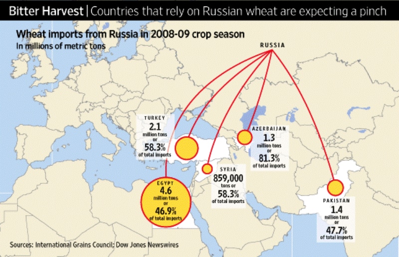 . Зерно с терминалов новороссийского порта, который считается четвертым в Европе по грузообороту, могло поставляться в Египет, Турцию, Пакистан, Азербайджан и другие страны-импортеры из России. Теперь они ищут альтернативные источники, и проблема усугубляется тем, что производители из соседних с Россией стран, в частности Казахстан и Украина, считаются ненадежной заменой. Казахстан в прошлом году экспортировал 5,8 млн тонн пшеницы, но аналитики не исключают, что, состоя в таможенном союзе с Россией, он тоже запретит экспорт и направит высококачественную пшеницу в Россию. На прошлой неделе и правительство Украины заговорило о введении квот на экспорт пшеницы.