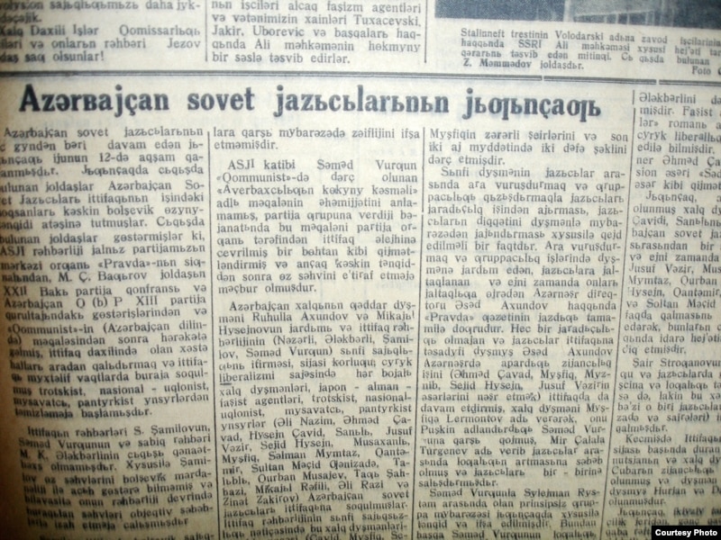 Azərbaycan xalqının qəddar düşməni Ruhulla Axundov və Mikayıl Hüseynovun yardımı və ittifaq rəhbərliyinin (Nəzərli, Ələkbərli, Şamilov, Səməd Vurğun) sinfi sayıqlığını itirməsi, siyasi korluğu, çürük liberalizmi sayəsində hər boyalı xalq düşməni, yapon- alman-faşist agentləri, trotskist, nasional-uqlonist, müsavatçı, panturkist ünsürlər (Əli Nazim, Əhməd Cavad, Hüseyn Cavid, Yusif Vəzir, Sanılı, Seyid Hüseyn, Musaxanlı, Müşfiq, Mümtaz, Qantəmir, Sultan Məcid Qənizadə, Talıblı, Qurban Musayev, Tağı Şahbazi, Mikayıl Rəfili, Əli Razi və Zinət Zakirov) Azərbaycan sovet yazıçıları ittifaqına soxulmuşlar.