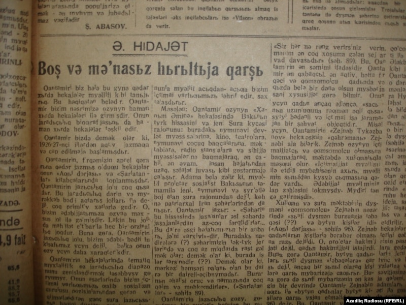 “Kommunist” qəzetinin 3 fevral 1936 –cı il sayında Ə. Hidayət imzalı müəllifin Qantəmir (Qafur Əfəndiyev – 1884-1944) haqqında bir məqaləsi yer alır. Qantəmir sovet repressiya maşınının hədəfə aldığı yazarlardan idi.