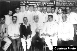 Azərbaycan yazıçılarının I qurultayının iştirakçıları. Sağdan: Rəşid bəy Əfəndiyev, V.Vişnevski, A.Şirvanzadə, Abdulla Şaiq, Yusif Vəzir Çəmənzəminli, ayaq üstə (sağdan sola): Qurviç, M.Rəfili, C.Cabbarlı, Qantəmir (Əfəndiyev), M.S.Ordubadi, Əhməd Cavad, Səməd Vurğun, M.Hüseyn. 13 iyun 1934.