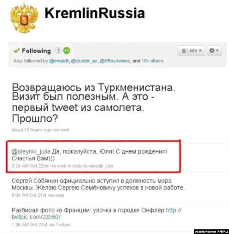 Antonio yazır ki, bu günlərdə Rusiya mətbuatında «maraqlı hadisə» baş verib. «Maraqlı hadisə» isə Rusiya perzidentinin «Twitter» mikroblogunda gənc qızı təbrik etməsi olub.