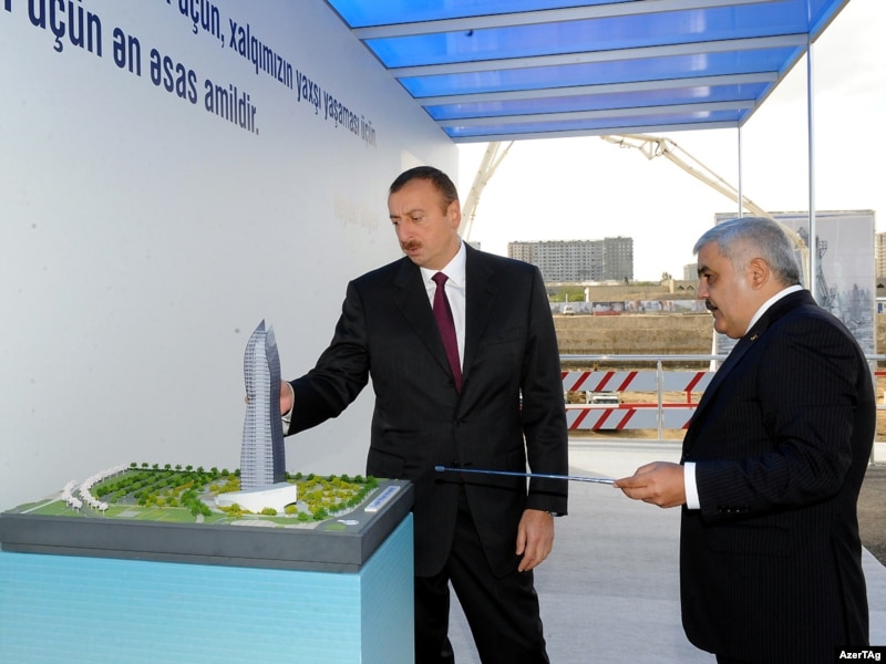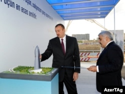 Ильхам Алиев (слева) рассматривает проект нового здания SOCAR, Баку, 12 октября 2010