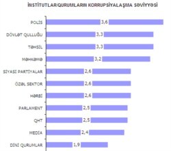 “Transparency International” – Beynəlxalq Şəffaflıq Təşkilatının Azərbaycanda apardığı sorğulara görə ölkədə ən çox korrupsiyalaşmış sahə polis orqanlarıdır. Ondan sonra dövlət qulluğu, təhsil, məhkəmələr gəlir.