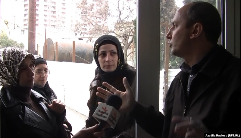 Bakının Yasamal rayonundakı 18 saylı orta məktəbdə dərsdən çıxarılan hicablı şagirdlərin valideynləri ilə məktəbin direktor müavini elə qapının ağzındaca mübahisə edirlər.