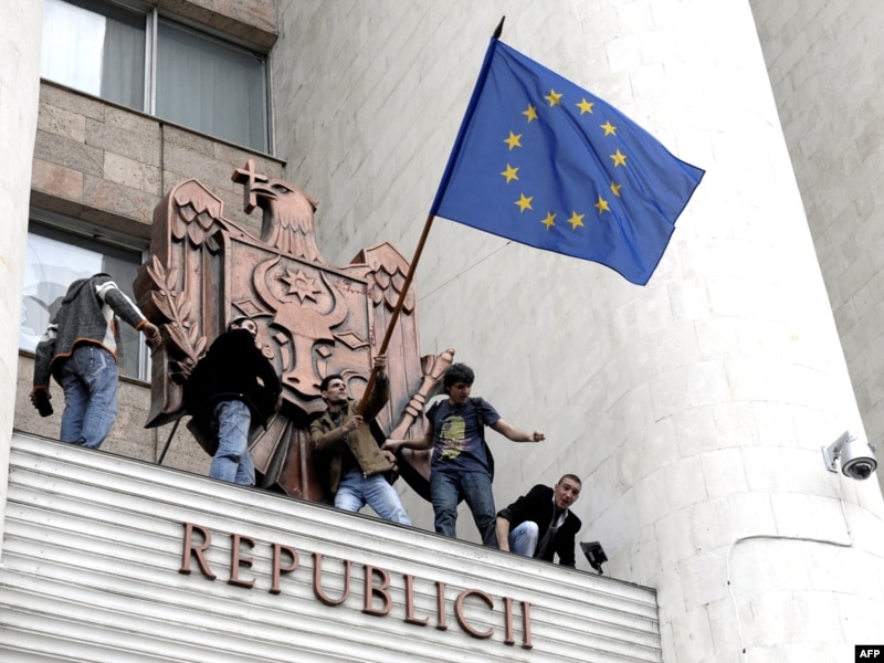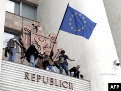 Moldovada etirazçılar parlament binasından Avropa Birliyinin bayrağını yellədirlər