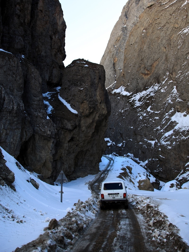 Yolun bəzi yerlərində asfaltı daş-kəsək, çınqıl əvəzləyir. Ayətşah əmi ara-sıra sürüşmə olduğundan asfaltın dağıldığını, ancaq yolun Nəqliyyat Nazirliyinin işçiləri tərəfindən dərhal təmizləndiyini əlavə edir. Onu da qeyd etməliyəm ki, yol boyunca maşınların qarda sürüşməsinin qarşısını almaq üçün qum topaları gözə dəyirdi.