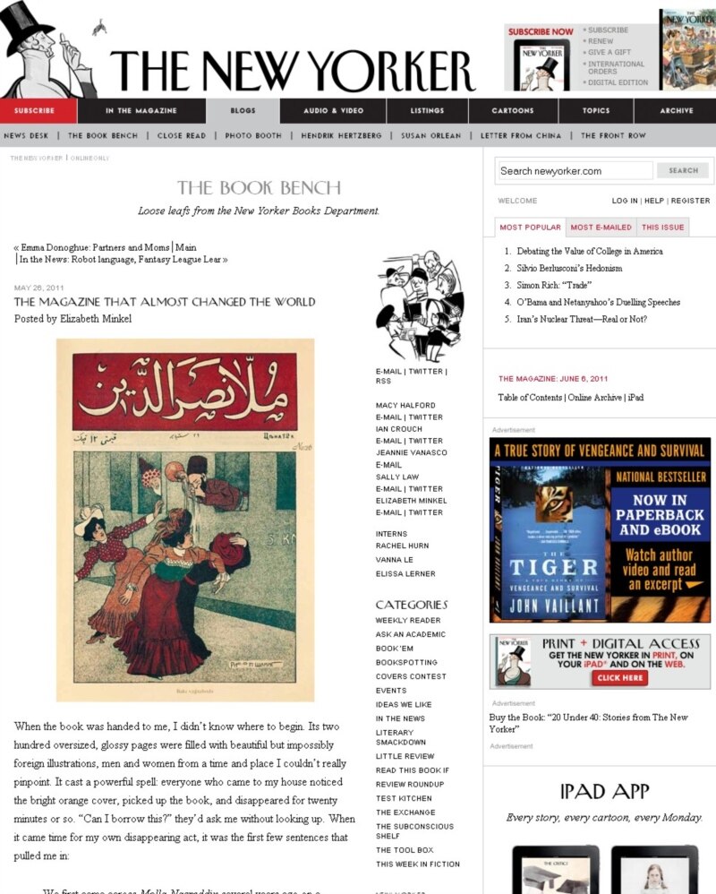 Elizabeth Minkel yazır ki, kitabla ilk tanışlığı Bakıda – Qız qalasına yaxın bukinistdə başlayıb. «Molla Nəsrəddin» jurnallarının toplandığı kitab öz ölçüsü, çəkisi, çap keyfiyyəti və paqlaq rəngləri ilə sovet dövrünün boz kitab yığını arasında seçilirmiş. O, dükançı Elmanla «Molla Nəsrəddin»ə tamaşa edir, kitab da bir təsvirəgəlməz gözəllik olaraq onları «süzürmüş».