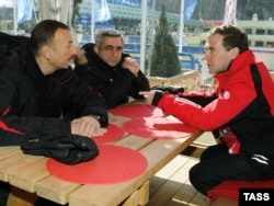 (soldan sağa) Azərbaycan prezidenti Əliyev, Ermənistan prezidenti Sarkisyan və Rusiya prezidenti Medvedev. Krasnaya Polyana, 5 mart 2011'