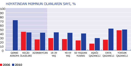 2006-cı illə müqayisədə həyatından məmnun olanların sayı artıb. Sorğuda iştirak edənlərin 40 faizi həyatından razı olduğunu bildirib. Razı qalanlar əsasən orta gəlirli adamlardır. Sorğu iştirakçılarının yardan çoxu ölkənin ümumi sosial-iqtisadi vəziyyətinin 2006-cı ildən daha yaxşı olduğunu qeyd edib.