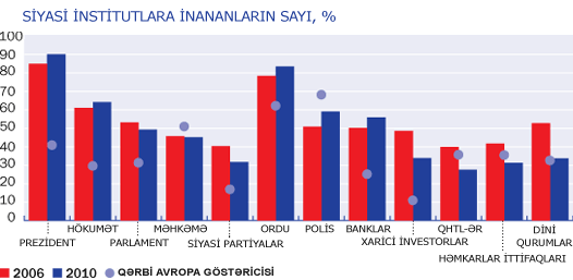 Buna baxmayaraq, dövlət qurumlarına inam Qərbi Avropa göstəricindən daha yuxarıdır. Respondentlərin yarıdan çoxu prezidentə və silahlı qüvvələrə inandığını bildirir.