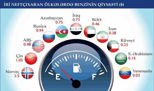 Dünyada ən ucuz benzini Venesuelada almaq olar, burada 1 litr yanacaq 3 sentdir. İkinci yerdə Liviyadır, müharibəyə qədər bu ölkədə 1 litr yanacaq 13 sent idi. Üçüncü yeri Səudiyyə Ərəbistanı tutur – 16 sent. Sonrakı yerlər belə bölüşür: Türkmənistan 20, Bəhreyn 21, Qətər 22, Küveyt 23, Oman 31 sent. Bu ölkələrdə benzin neftdən ucuzdur.