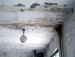 С потолка фойе на первом этаже с осыпавшейся штукатуркой лилась вода