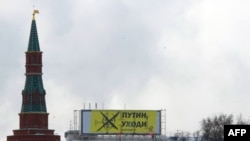 «Путин уходи» (Putin, get) sözləri yazılmış banner