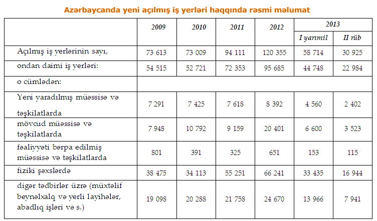Azərbaycan Respublikası üzrə yeni açılmış iş yerləri haqqında məlumat