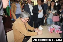 Sonda yazıçı oxucuları üçün kitablarını sol əli ilə imzalayıb.