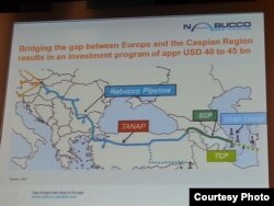 Daha sonra prezident deyib: «TANAP və TAP Avropaya yeni mənbədən qaz gətirəcək. İlkin hesablamalara görə, bunun üçün 45 milyard dollar sərmayə nəzərdə tutulub. TANAP-da ən böyük səhmdar Azərbaycandır. Azərbaycan həm düşünülmüş siyasət