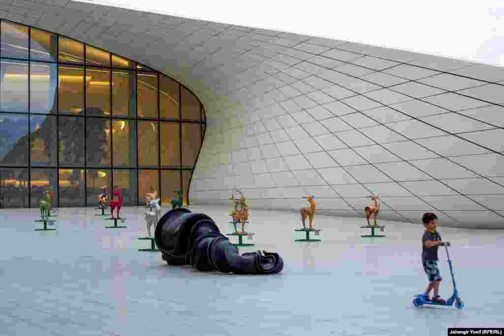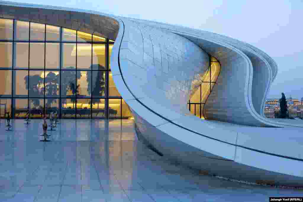 Tikintisi 2007-də başlanan və 2012-ci ildə bitən Heydər Əliyev Mərkəzinin memarı Zaha Hadiddir. Memarlıq özəllikləri yüksək qiymətləndirilən Mərkəz insan haqları pozuntularından dolayı beynəlxalq mediada tənqid olunur. Fotolar Cahangir Yisifə məxsusdur.