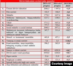 Büdcədə müdafiə xərcləri ötən illə müqayəsidə 8,6 faiz daha çox – 1 milyard 778 milyon manat nəzərdə tutulub. Büdcə xərcləri arasında yanacaq və enerji xərcləri azı 2 dəfə daha çox- 7 milyon 600 min manata, sənaye və tikinti xərcləri 10,7 faiz artırılaraq 6 milyard 951 milyon manata, səhiyyə xərcləri 7,2 faiz artırılaraq 777 milyon manata çatdırılıb. Ümumilikdə büdcədə bir çox sahələr üzrə xərclər artırılsa da elm, məhkəmə hakimiyyəti, hüquq mühafizə və prokurorluq, eləcə də sosial müdafiə və sosial təminat xərcləri 2014-cü illə müqayisədə azaldılıb.