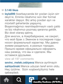 Prezident İlham Əliyevin qızı Leyla Əliyeva özünün rəsmi İnstagram səhifəsindən əri biznesmen və müğənni Emin Ağalarovla evliliyinin pozulması haqda yazıb: