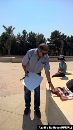 40 dərəcə istidə - günün altında durub məqbərəyə baxır, sonra əlindəki kağıza nəsə cızır.