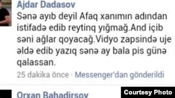 Mesaj mətni belə idi: "Orxan, mənə öz nömrəni yaz, səninlə çox səmimi söhbətim olacaq". Mən də telefon nömrəmi yazdım. Bu günsə zəng edib təhqir və təhdid etdi.”