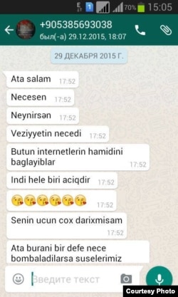 "Axırıncı dəfə avqustun 19-da yazmışdılar, ondan sonra xəbərim yox idi, çox nigaran idim. Dekabrın 29-da axşam 17.52-də qəfildən mesaj gəldi, böyük qızım Həzrin yazırdı: "Ata, salam, necəsən? Vəziyyətin necədi? Burada bütün internetləri bağlayıblar, indi hələ biri açıqdı. Sənin üçün çox darıxmışam. Ata buranı bir dəfə necə bombaladılarsa, şüşələrimiz qırıldı. Bizə görə narahat olma, biz yaxşıyıq". Ondan sonra yenə də uşaqlarımdan xəbərim yoxdu. Heç uşaqlar özləri də dəqiq bilmirlər ki, haradadılar. Bir dəfə yazır ki, Rakka şəhərindəyik, bir dəfə yazır ki, Mosuldayıq..."