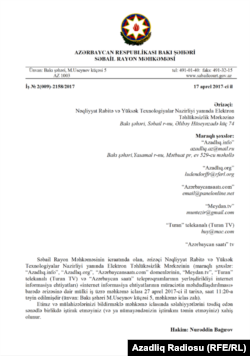 İddia azadlıq.info, azadlıq.org, azərbaycansaatı.com, meydan.tv saytlarını, Turan” telekanalı (Turan TV) və “Azərbaycan saatı” teleproqramlarına girişin məhdudlaşdırılması ilə bağlıdır.