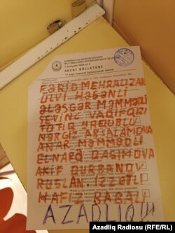 Üzərində 17 saylı Yasamal seçki dairəsinə aid olduğu bildirilən bu bülleteni seçici AzadlıqRadiosuna göndərib. Orada həbsdə olan bəzi jurnalist, ictimai fəal və müxalifətçilərə azadlıq tələb edilir.