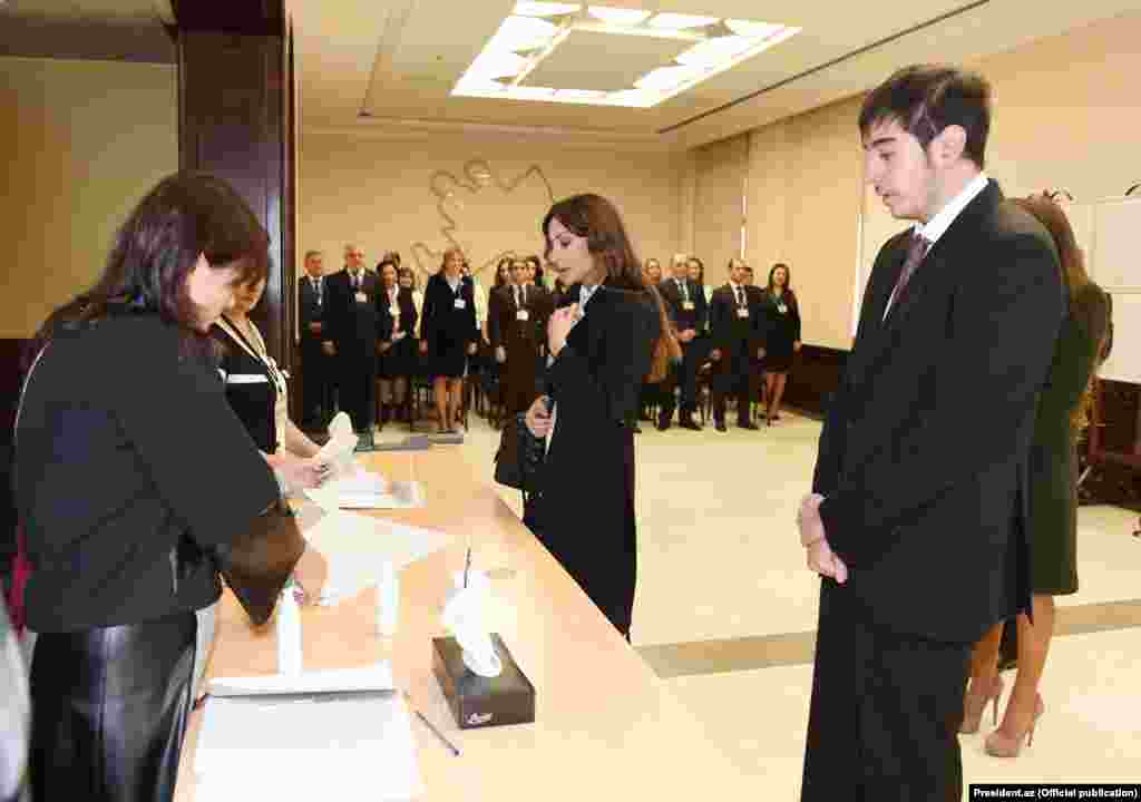 Məntəqə seçki komissiyasının sədri Rüfət Həsənov ilk dəfə səs verməsi münasibətilə İlham Əliyevin oğlu- Heydər Əliyevi Mərkəzi Seçki Komissiyasının adından təbrik edib.